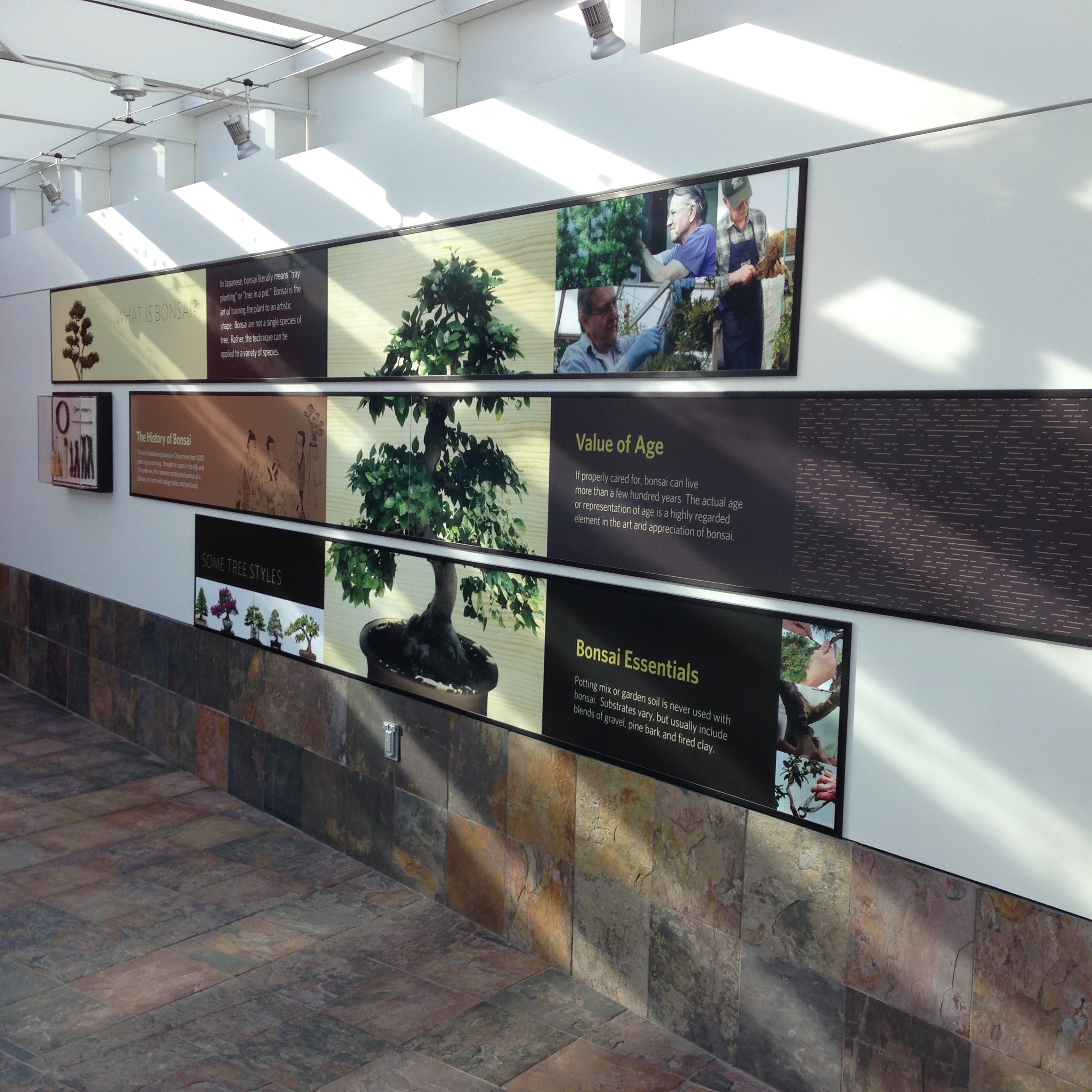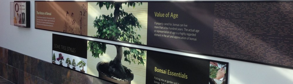 The Como Park Zoo and Conservatory Master Plan identified the need for an outdoor bonsai exhibit and a transitional landscape connecting to the acclaimed Japanese Garden. The Division of Parks and Recreation and the Como Zoo and Conservatory Society recognized an opportunity to include an indoor Bonsai Gallery contiguous with these outdoor spaces. In response to the Conservatory’s requested an approach that focuses on the exhibits (seen here) and accommodates special events, Close Landscape Architecture, the 106 Group, and Lunning Wende proposed a building that merges with the landscape and complements the existing Conservatory buildings, I designed the exhibit panels.